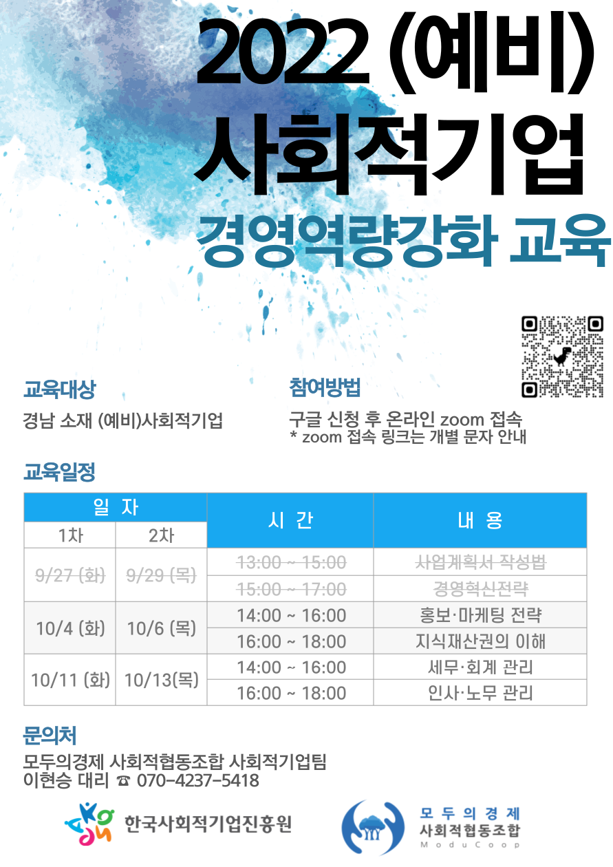 2022년 (예비)사회적기업의 경영 역량강화를 위해 교육을 진행하오니 많은 참여 바랍니다.