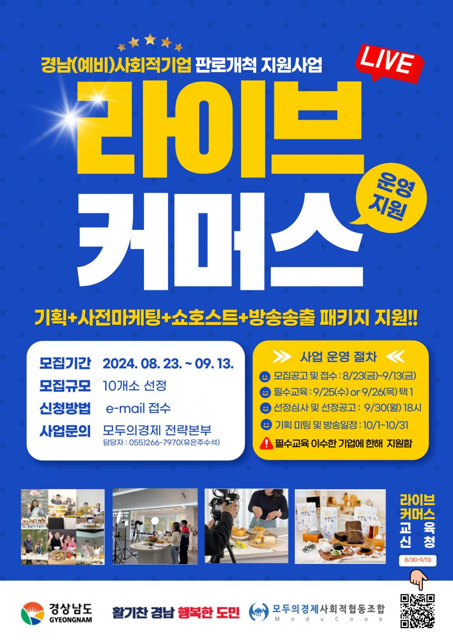 경상남도 소재 (예비)사회적기업의 온라인 판매 채널 확보와 매출 향상을 목표로 라이브커머스 지원사업에 참여할 기업을 다음과 같이 모집하오니 많은 관심과 참여 부탁드립니다.